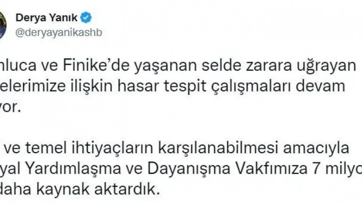 Aile ve Sosyal Hizmetler Bakanı Derya Yanık, Kumluca ve Finike'de yaşanan selde zarara uğrayan vatandaşlar için 7 milyon lira daha kaynak aktarıldığını duyurdu.