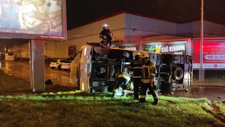 Kaza, saat 23.30 sıralarında İzmit Körfez Mahallesi, D-100 yan yol üzerinde meydana geldi. Edinilen bilgiye göre seyir halindeki sürücü C.A.'nın aracının direksiyon hakimiyetini kaybetmesi üzerine 41 P 0513 plakalı servis midibüsü yol üzerinde bulunan bir binaya çarptı. Çarpmanın etkisiyle savrulan midibüs refüje dalarak devrildi. Şans eseri boş olan midibüsün şoförü C.A. yaralandı. Çevredekilerin ihbarı üzerine olay yerine itfaiye, sağlık ve polis ekipleri sevk edildi. Araç içerisinde sıkışan sürücü itfaiye ekiplerinin çalışmaları sonucunda araçtan çıkarılarak sağlık ekiplerine teslim edildi. Yaralı şoför, ambulansla Kocaeli Devlet Hastanesine kaldırıldı. Kaza sebebiyle yan yol yaklaşık bir saat trafiğe kapandı. Ekiplerin çalışmaları sonucu yol trafiğe açılırken polis kazaya ilişkin inceleme başlattı.