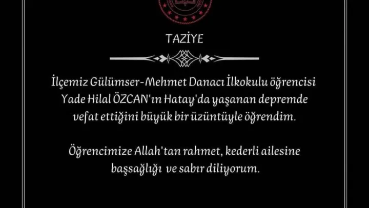 Bodrum İlçe Milli Eğitim Müdürü Bülent Aldal, yaptığı paylaşımda 'İlçemiz Gülümser Mehmet Danacı İlkokulu öğrencisi Yade Hilal Özcan'ın Hatay'da yaşanan depremde vefat ettiğini büyük bir üzüntüyle öğrendim. Öğrencimize Allah'tan rahmet, kederli ailesine başsağlığı ve sabır diliyorum' dedi.