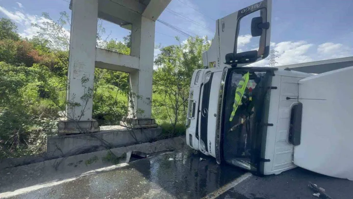 Arnavutköy'de otomobilin çarptığı kamyon yan yattı: 1 yaralı