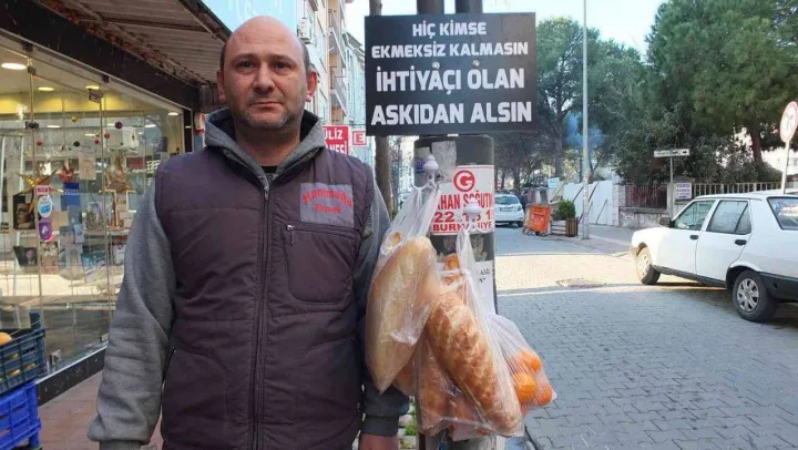 Burhaniye ilçesinde, bakkallık yapan Gökhan Budak'ın başlattığı askıda ekmek uygulaması yoğun ilgi gördü. Manavlık ta yapan Budak, askıya mandalina, muz ve elma gibi meyveleri de asmaya başladı.