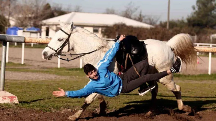 Yabancı jokeylerin akrobasi gösterilerini izleyerek kendi uyguladı