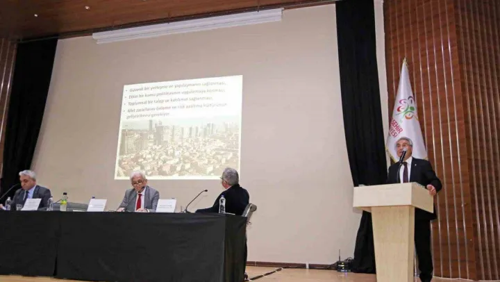 Toplantının devamında Türk Mühendis ve Mimar Odaları Birliği Eski İnşaat Mühendisleri Odası Genel Başkanı Cemal Gökçe, 'Doğal afetler ve ortaya çıkan sorunlar nelerdir, güvenli bir yerleşme ve yapılaşmanın sağlanması için neler yapılmadır, afetlere karşı dayanıklı ve sürdürülebilir bir gelişmeyi sağlamak için yapılması gerekenler nelerdir' konuları hakkında bilgilendirmeler yaptı.