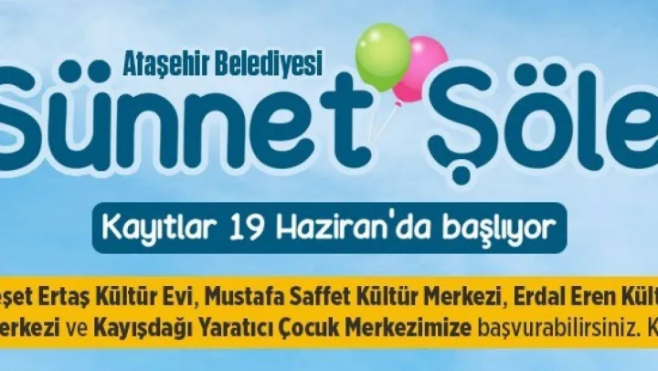 Çocuklarını sünnet ettirmek isteyen Ataşehirli aileler başvurularını, Neşet Ertaş Kültür Evi, Erdal Eren Kültür Merkezi, Mustafa Saffet Kültür Merkezi, Ferhatpaşa Gençlik Merkezi ile Kayışdağı Yaratıcı Çocuk Merkezi'ne yapabilirler.