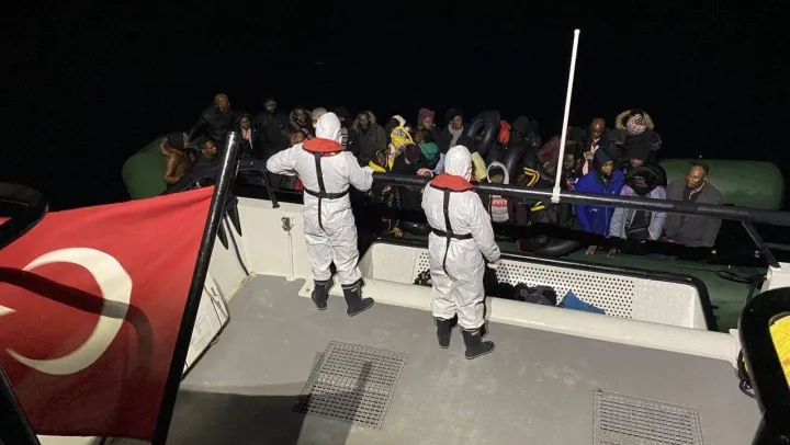 Çanakkale'nin Ayvacık ilçesi açıklarında Sahil Güvenlik ekiplerince lastik bot içinde 54 kaçak göçmen yakalandı.