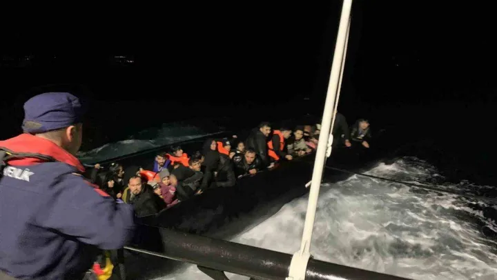 Balıkesir'in Ayvalık ilçesinde mobil radar tarafından tespit edilen düzensiz göçmen botunda 54 kişi Yunanistan'ın Midilli Adası'na yasa dışı yollardan geçmek isterken Sahil Güvenlik tarafından yakalandı.