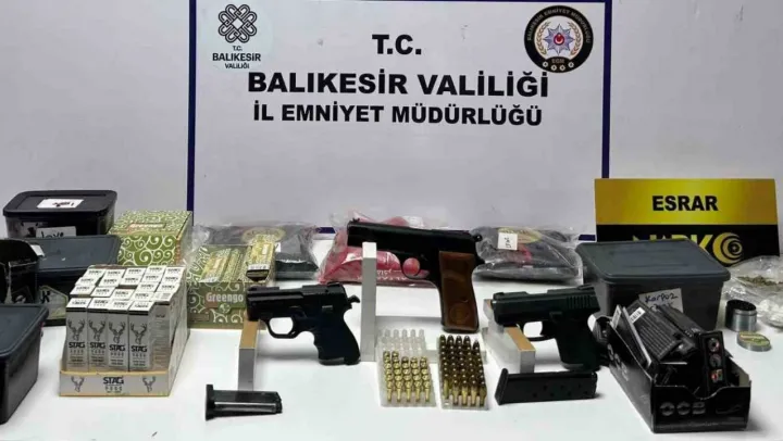 Edinilen bilgiye göre, Balıkesir İl Emniyet Müdürlüğü KOM birimlerince yapılan saha çalışmalarında, Ayvalık ilçesinde bir adrese yönelik yapılan operasyonda; 2 adet 7.65 mm tabanca, 1 adet 9 mm çapında tabanca, 27 adet 7.65 mm fişek, 43 adet 9 mm fişek, 18,90 gram Esrar maddesi, 21 adet cinsel ürün, 7 kilo 600 gram nargile tütünü, 90 adet sigara kağıdı ele geçirildi. Konuyla ilgili S.K. hakkında adli işlemlere başlanıldı.