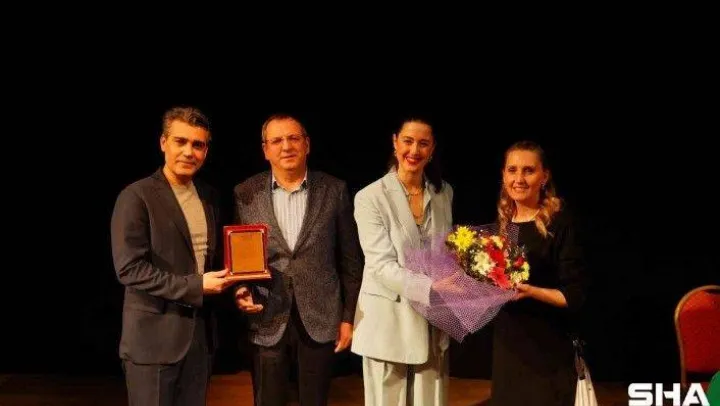 Başkan Ergin ve eşi Canan Ergin; Birkan ve Cindoruk'a plaket ve çiçek takdim ederek başarılı bir oyun sergilemeleri nedeniyle her iki sanatçıyı da kutladı.
