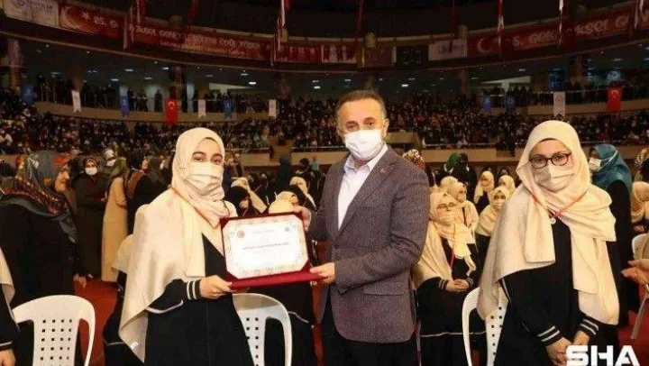 Bağcılar'da hafızlık kursunu başarıyla tamamlayan 111 kız hafız, Olimpik Spor Salonu'nda düzenlenen coşkulu bir törenle hem icazet belgelerini aldı hem de taçlarını taktı. Programa katılan TBMM Başkanı Mustafa Şentop'un annesi ve eşi de hafizeleri tebrik etti.