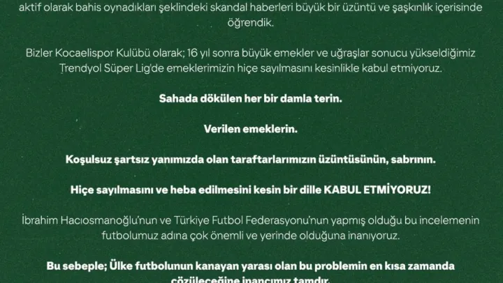 'Türkiye Futbol Federasyonu Başkanı İbrahim Hacıosmanoğlu'nun bugün gerçekleştirdiği basın toplantısında dile getirdiği, bazı hakemlerin bahis hesaplarının olduğu ve bu hesaplardan aktif olarak bahis oynadıkları şeklindeki skandal haberleri büyük bir üzüntü ve şaşkınlık içerisinde öğrendik. Bizler Kocaelispor Kulübü olarak 16 yıl sonra büyük emekler ve uğraşlar sonucu yükseldiğimiz Trendyol Süper Lig'de emeklerimizin hiçe sayılmasını kesinlikle kabul etmiyoruz.