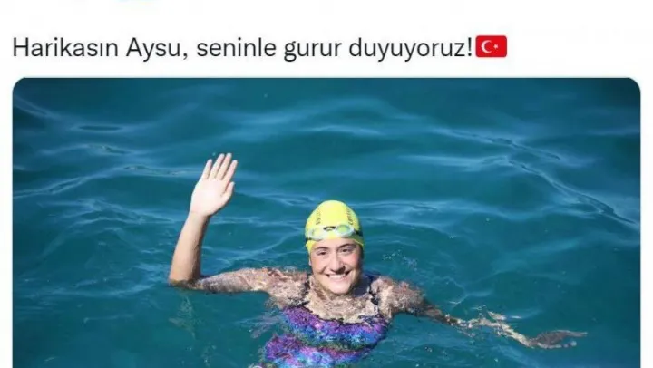 Gençlik ve Spor Bakanı Mehmet Muharrem Kasapoğlu, Manş Denizi'ni yüzerek 16 saat 28 dakikada geçen ve ‘Manş Denizi'ni yüzerek geçen en genç Türk' unvanını elde eden Aysu Türkoğlu'nu sosyal medya hesabından yaptığı paylaşımla tebrik etti. Bakan Kasapoğlu paylaşımında, “Manş Denizi'ni yüzerek geçen en genç Türk: Aysu Türkoğlu. Harikasın Aysu, seninle gurur duyuyoruz” ifadelerine yer verdi.
