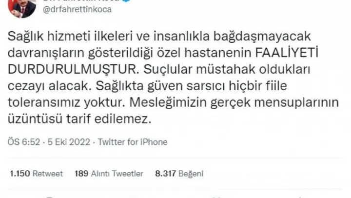 Sağlık Bakanlığı'na bağlı müfettişlerin özel hastanedeki incelemelerinin ardından olay hakkında sosyal medya hesabı üzerinden bir kez daha paylaşımda bulunan Bakan Koca, "Sağlık hizmeti ilkeleri ve insanlıkla bağdaşmayacak davranışların gösterildiği özel hastanenin faaliyeti durdurulmuştur. Suçlular müstahak oldukları cezayı alacak. Sağlıkta güven sarsıcı hiçbir fiile toleransımız yoktur. Mesleğimizin gerçek mensuplarının üzüntüsü tarif edilemez” dedi.