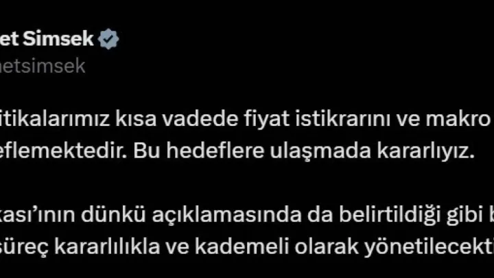 Hazine ve Maliye Bakanı Mehmet Şimşek sosyal medya hesabından yaptığı paylaşımda, 'Ekonomi politikalarımız kısa vadede fiyat istikrarını ve makro finansal istikrarı hedeflemektedir. Bu hedeflere ulaşmada kararlıyız. Merkez Bankası'ının dünkü açıklamasında da belirtildiği gibi bu bir süreçtir. Bu süreç kararlılıkla ve kademeli olarak yönetilecektir' ifadelerini kullandı.