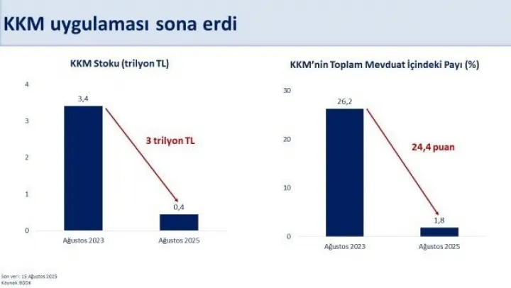 Şimşek, 'Zirve seviyesi 3,4 trilyon lira (143 milyar dolar) olan KKM bakiyesi uyguladığımız program sayesinde iki yıldır kesintisiz azalarak 15 Ağustos itibarıyla 441 milyar liraya (11 milyar dolar) geriledi. Önemli bir şartlı yükümlülük olan KKM'nin sonlanmasıyla finansal istikrar daha da güçlenecek' açıklamasında bulundu.