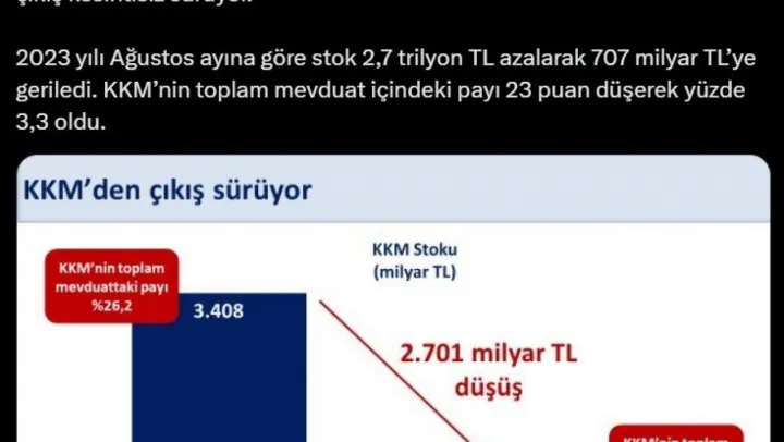 Bakan Şimşek, sosyal medya hesabından yaptığı paylaşımda, 'Makro finansal istikrarı güçlendiren politikalarımız sayesinde KKM'den çıkış kesintisiz sürüyor. 2023 yılı Ağustos ayına göre stok 2,7 trilyon TL azalarak 707 milyar TL'ye geriledi. KKM'nin toplam mevduat içindeki payı 23 puan düşerek yüzde 3,3 oldu' ifadelerini kullandı.