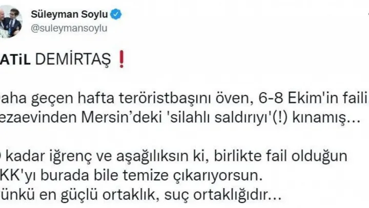 HDP eski Eş Genel Başkanı Selahattin Demirtaş, Mersin'de polisevine PKK'lı teröristlerce düzenlenen saldırıyı kınadığını duyurmuştu. Demirtaş'ın yaptığı paylaşımın ardından İçişleri Bakanı Süleyman Soylu bahsi geçen paylaşımı alıntılayarak, “Katil Demirtaş! Daha geçen hafta teröristbaşını öven, 6-8 Ekim'in faili, cezaevinden Mersin'deki 'silahlı saldırıyı'(!) kınamış. O kadar iğrenç ve aşağılıksın ki, birlikte fail olduğun PKK'yı burada bile temize çıkarıyorsun. Çünkü en güçlü ortaklık, suç ortaklığıdır” ifadelerini kullandı.