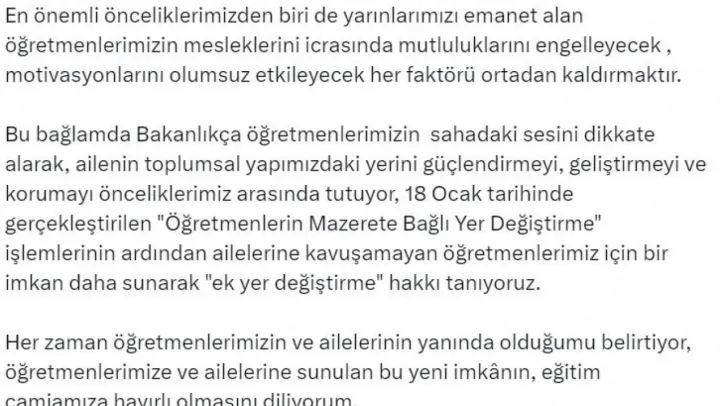 Milli Eğitim Bakanı Yusuf Tekin, 'Ailelerine kavuşamayan öğretmenlerimiz için bir imkan daha sunarak, ek yer değiştirme hakkı tanıyoruz' dedi.