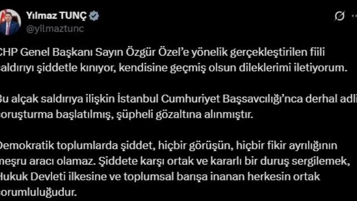 Adalet Bakanı Yılmaz Tunç, 'CHP Genel Başkanı Özgür Özel'e yönelik gerçekleştirilen fiili saldırıyı şiddetle kınıyor, kendisine geçmiş olsun dileklerimi iletiyorum' dedi.