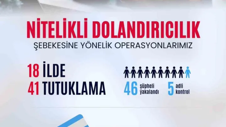 İçişleri Bakanı Yerlikaya sosyal medya hesabından yaptığı paylaşımda, Tekirdağ merkezli 18 ilde 'Nitelikli Dolandırıcılık Şebekesine' yönelik düzenlenen operasyonlarda; 46 şüphelinin yakaladığını 41'inin ise tutuklandığını belirterek, şu ifadelere yer verdi: