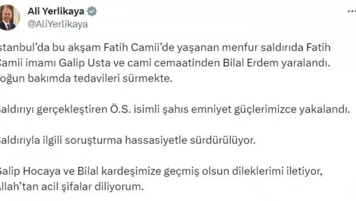 İstanbul'da Fatih Camii İmamı Galip Usta'ya yönelik saldırıya ilişkin sosyal medya hesabından açıklamada bulunan İçişleri Bakanı Ali Yerlikaya, 'İstanbul'da bu akşam Fatih Camii'nde yaşanan menfur saldırıda Fatih Camii İmamı Galip Usta ve cami cemaatinden Bilal Erdem yaralandı. Yoğun bakımda tedavileri sürmekte. Saldırıyı gerçekleştiren Ö.S. isimli şahıs emniyet güçlerimizce yakalandı. Saldırıyla ilgili soruşturma hassasiyetle sürdürülüyor. Galip hocaya ve Bilal kardeşimize geçmiş olsun dileklerimi iletiyor, Allah'tan acil şifalar diliyorum' ifadelerini kullandı.