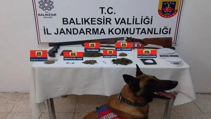 Balıkesir İl Jandarma Komutanlığı ekipleri uyuşturucu madde imal ve ticaretine yönelik yapılan istihbari çalışmalar neticesinde Altıeylül, Edremit, Gömeç, Gönen ve İvrindi İlçelerinde uyuşturucu madde ticareti yaptığı ve bulundurduğu tespit edilen 14 şüphelinin araç ve ikamet adreslerinde yapılan aramalarda; 426 gram toz esrar, 150 gram kubar esrar, 65 gram marihuana, 26 gram metamfetamin, bin 89 adet sentetik uyuşturucu hap, 100 gram kenevir tohumu, 8 adet uyuşturucu kullanma aparatı, 2 adet hassas terazi, 1 adet tabanca, 2 adet av tüfeği, 9 adet fişek ve 1 adet cep telefonu ele geçirildi.