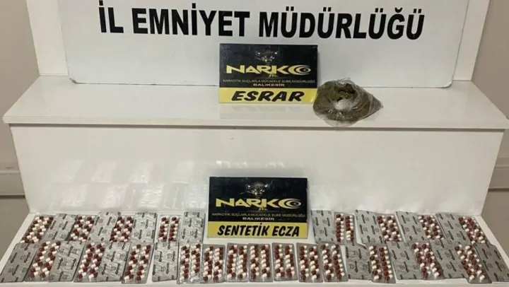 Balıkesir'de narkotik ve istihbarat şube ekipleri il merkezi girişinde bir araçta yaptıkları operasyonda bin 120 adet sentetik ecza hapı ve 103 gram skunk esrar ele geçirdiler. Araçta bulunan 2 şüpheli şahıs gözaltına alındı.