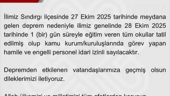 Balıkesir'in Sındırgı ilçesinde meydana gelen 6.1 büyüklüğündeki depremin ardından Balıkesir Valiliği tarafından il genelinde okulların bir gün süreyle tatil edildiği açıklandı.