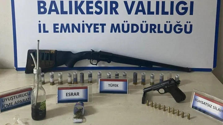 Balıkesir İl Emniyet Müdürlüğü Asayiş, Narkotik ve Organize Suçlarla Mücadele Şube Müdürlüğü ekipleri genel güvenliği ve asayişi sağlamak amacıyla son 1 haftada Altıeylül, Karesi, Ayvalık, Bandırma, Burhaniye, Edremit, Erdek, Gömeç, Gönen, Havran, İvrindi, Kepsut, Savaştepe, Sındırgı ve Susurluk ilçelerinde çeşitli suçlardan aranan 273 şahsı gözaltına aldı. Adli makamlara sevk edilen şahıslardan 89'u tutuklandı. Yapılan aramalarda 21 adet ruhsatsız tabanca ve 138 adet fişek, 10 adet ruhsatsız tüfek ve 53 adet kartuş, 14 adet kurusıkı tabanca ve 27 adet fişek, 1 kilo 32 gram esrar, 763 adet sentetik ecza hap, 212 gram metamfetamin maddesi, 86 kök kenevir bitkisi, 5 gram bonzai maddesi, 1 adet ecstasy hap, 5 adet hassas terazi ve 45 kilogram kaçak tütün ele geçirildi.