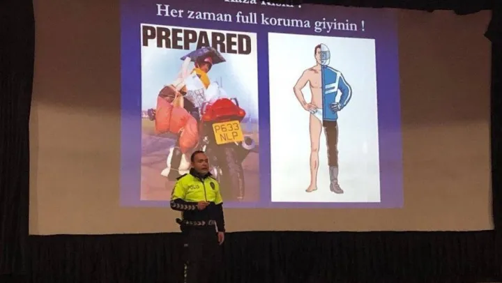 Bandırma İlçe Emniyet Müdürlüğü Trafik Denetleme Büro Amiri Komiser Akif Çiçen'in sunumuyla gerçekleşen seminerde 'Motosiklette Güvenli Sürüş' başlıklı bir sunum yaptı. Çiçen, seminerde katılımcılara motosiklette güvenli sürüşte kask, koruyucu elbise ve eldiven gibi pasif güvenlik uygulamalarını, abs gibi aktif güvenlik uygulamalarını ayrıca eğitimler ve seminerler gibi önleyici güvenlik uygulamalarını anlattı. Etkinlikte sürüş tecrübesinin öneminden bahseden Çiçen, Güvenli sürüş, motosiklet koruyucu ekipmanlarının önemini, kaza riskinin oluşturacak diğer sürücülerin hatalarını, çevre faktörlerinin etkilerini motosikletin eksikliklerinden ve sürücünün kendisinden kaynaklanan kaza riskini ,motosiklette görünür olmanın son olarak ise trafikte saygı konusunu anlatan Çiçen akabinde katılımcıları dinleyerek sorularını cevapladı. Etkinliğin sonunda motor sürücülerinin diğer sürücüler tarafından fark edilebilmesi için reflektörlü yelek verildi ve seminer son buldu.
