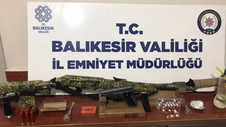 Uygulamada ve yapılan arama çalışmaları sonucunda 1 adet ruhsatsız tüfek ve 7 adet dolu kartuş, 3 adet kuru sıkı tabanca ve 7 adet kurusıkı mermisi, 2 adet ruhsatsız tabanca, 4 adet 7,65 mm tabanca fişeği, 11 adet 9 mm tabanca fişeği, 1 adet 6,35 mm tabanca fişeği, 0,60 gram metamfetamin, 2,70 gram esrar, 19 adet sentetik ecza hap, 2 adet uyuşturucu kullanma düzeneği ve 1 adet bıçak ele geçirildi.