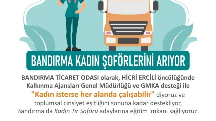 Lojistik sektöründe yaşanan tır şoförü eksikliğinin giderilmesine yönelik Bandırma Ticaret Odası, Kalkınma Ajansları Genel Müdürlüğü ve GMKA iş birliği ile Hicri Ercili Şirketler grubu öncülüğünde kadın istihdamına yönelik 'Kadın istese her alanda çalışabilir' diyor ve 'Kadın Tır Şoförü Eğitimi' projesi ile eğitimlerine başlıyor. Bandırma Ticaret Odası Başkanı Adem Yılmaz, 'Kadınlarımızın her alanda iş bulma konusunda olanak sağlamak ve destek olmak amacıyla böyle bir bölgesel iş gücüne ve ihtiyaçların giderilmesine yönelik projeler üretmeye devam edeceğiz' dedi.