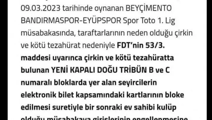 Profesyonel Futbol Disiplin Kurulu'nun 14.03.2023 tarih ve 46 sayılı toplantısında almış olduğu kararlar belirlendi. Yapılan yazılı açıklamada, 'Bandırmaspor Kulübünün, 09.03.2023 tarihinde oynanan Bandırmaspor-Eyüpspor Spor Toto 1. Lig karşılaşmasında, taraftarlarının neden olduğu yakışıksız ve kötü tezahürat nedeniyle FDT'nin 53/3. unsuru uyarınca berbat ve kötü tezahüratta bulunan yeni kapalı doğu tribün B ve C numaralı bloklarda yer alan seyircilerin elektronik bilet kapsamındaki kartlarının bloke edilmesi suretiyle bir sonraki ev sahibi kulüp olduğu karşılaşmaya girişlerinin engellenmesine, karşılaşmada Beyçimento Bandırmaspor Kulübünün, taraftarının neden olduğu saha olayları nedeniyle 28 bin TL para cezası ile cezalandırılmasına, karar vermiştir' denildi.