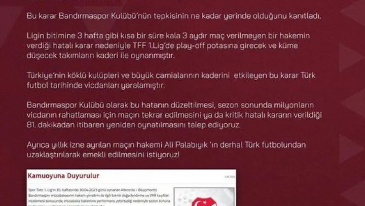 Bandırmaspor Kulübü olarak bu hatanın düzeltilmesi, sezon sonunda milyonların vicdanın rahatlaması için maçın tekrar edilmesini ya da kritik hatalı kararın verildiği 81. dakikadan itibaren yeniden oynatılmasını talep ediyoruz. Ayrıca yıllık izne ayrılan maçın hakemi Ali Palabıyık 'in derhal Türk futbolundan uzaklaştırılarak emekli edilmesini istiyoruz' denildi.