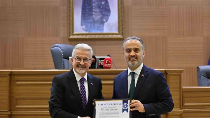Bursa Büyükşehir Belediyesi'nin 2019-2024 dönemi son meclis toplantısında konuşan Başkan Alinur Aktaş, '5 sene boyunca şehrimize değer katmak için gayret ettik. Biz büyük bir aileyiz ve bu ailenin üyeleri olarak şehrimizin bugününü birlikte ihya ettik. Yarınlarına da birlikte karar verdik' dedi. Başkanı Aktaş, daha sonra meclis üyelerine birer teşekkür plaketi verdi.