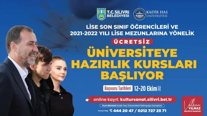 Silivri Belediye Başkanı Volkan Yılmaz'ın eğitime destek projeleri kapsamında Kadir Has Üniversitesi iş birliğiyle hayata geçirilen ücretsiz üniversiteye hazırlık kursu için başvuru süreci başladı. Kursa katılmak isteyen lise son sınıf öğrencileri ve 2021-2022 yılı lise mezunları, 12-20 Ekim 2022 tarihleri arasında başvuru yapabilecek.