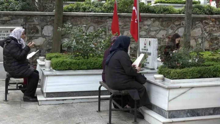 Bursa'da Ramazan Bayramı öncesi şehitlikleri ziyaret eden şehit yakınları, Kur'an-ı Kerim okuyarak dua etti.