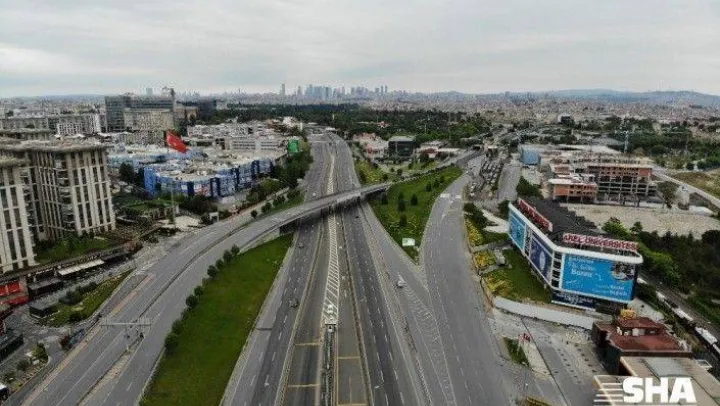Korona virüs tedbirleri kapsamında Ramazan Bayramının ikinci gününde sokağa çıkma kısıtlaması nedeniyle İstanbul'da yollar boş kaldı. Duraklarda bekleyen vatandaşların olduğu görülürken E5 Karayolu'ndaki sessizlik drone ile havadan görüntülendi.