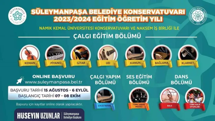 Süleymanpaşa Belediyesi, sanata ilgisi ve yeteneği olan herkesin kaliteli eğitim alabilmesi için çalışmalarını sürdürüyor. Yüzlerce sanatçı adayı yetiştiren ve akademik düzeyde müzik ve dans eğitimi veren bir kurum olarak dikkat çeken Süleymanpaşa Belediye Konservatuvarı, 2023-2024 Eğitim-Öğretim yılı öğrenci alımı için kayıt kabulüne başladı.