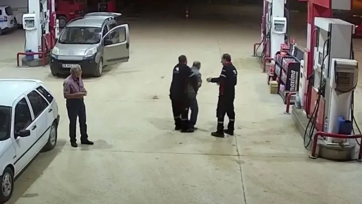 Nefes almakta zorlanan vatandaşın yardımına istasyon çalışanları koştu. İlk doğru müdahaleyi yapan istasyon çalışanları Heimlich manevrası ile vatandaşın hayatını kurtardı. İlk müdahale benzin istasyonunun güvenlik kameralarına saniye saniye yansıdı.