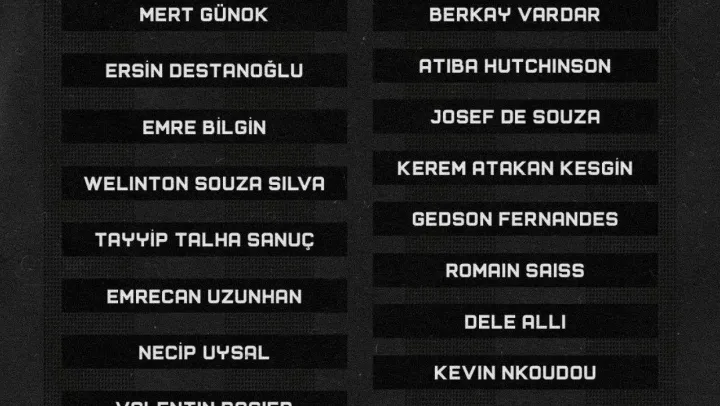 'Mert Günok, Ersin Destanoğlu, Emre Bilgin, Welinton, Tayyip Talha Sanuç, Emrecan Uzunhan, Necip Uysal, Valentin Rosier, Tayfur Bingöl, Arthur Masuaku, Umut Meraş, Berkay Vardar, Atiba Hutchinson, Josef de Souza, Kerem Atakan Kesgin, Gedson Fernandes, Romain Saiss, Dele Alli, Kevin Nkoudou, Nathan Redmond, Cenk Tosun, Jackson Muleka, Oğuzhan Akgün'