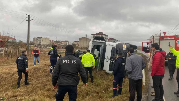 Tekirdağ Çorlu'da kaygan zeminde yoldan çıkan beton mikseri şarampole devrildi. Araçta mahsur kalan yaralı sürücüyü itfaiye ekipleri kurtardı.