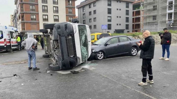 Beylikdüzü'nde özel bir kargo firmasına ait ticari minibüs, kamyonetin çarpmasıyla binek otomobilin üzerine devrildi. Kazada 2 kişi hafif şekilde yaralandı.