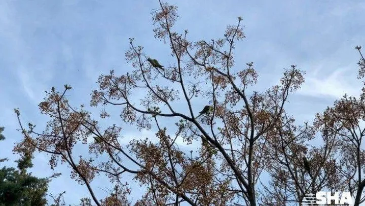 Beylikdüzü'nde vatandaşlar evde kal çağrılarına uyunca sokaklar kuşlara kaldı. İlçede boş kalan bir parktaki ağacın dallarında olan yeşil renkli papağanlar ise dikkat çekti.
