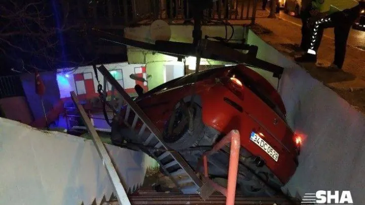 Beyoğlu'nda sürücüsünün kontrolünden çıkan otomobil, kaldırımdaki bariyerle kırıp çay bahçesinin merdivenlerine düştü. O sırada kimsenin bahçede olmaması kimse yaralanmadı.