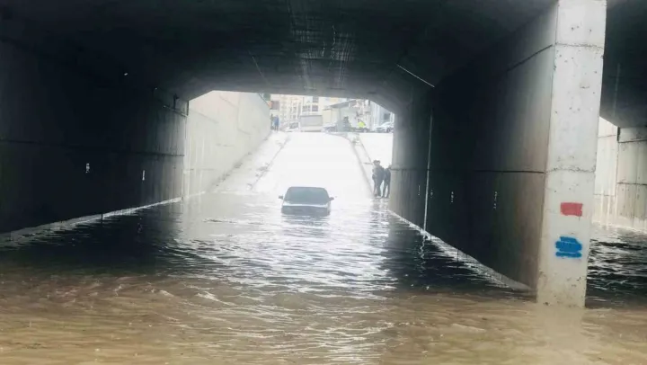 Bilecik'te öğleden sonra bastıran sağanak yağış hayatı felç ederken, su ile dolan alt geçitte bir araç mahsur kaldı.