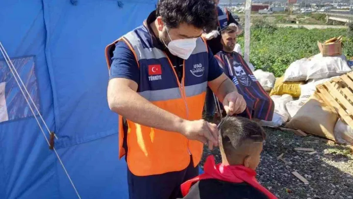 Hatay'ın Antakya ilçesinde eski hayvan pazarı çadır kentinde olduklarını anlatan berber Tahir Dere, 'Bilecik AFAD valilik tarafından düzenlenmiş berberlik hizmeti için burada hizmet ediyoruz, emeği geçen arkadaşlara teşekkür ediyoruz. Şu an Hatay'da bulunuyoruz Bilecik'ten geldik. Bilecik Valiliğinin düzenlemiş olduğu gönüllü berberler teşvikiyle gönüllü olarak Hatay'da hizmet ediyoruz. Çocukları, ihtiyacı olan insanları tıraş ediyoruz' dedi.