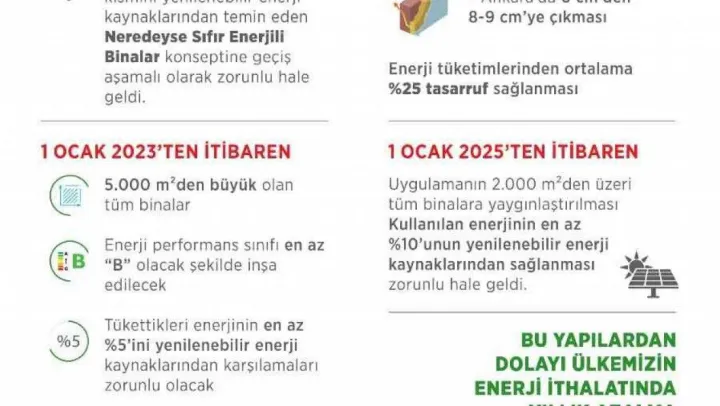 1 Ocak 2025 tarihinden itibaren bu uygulama 2 bin metrekare üzeri tüm binalarda yaygınlaştırılması ve kullanılan enerjinin en az yüzde 10'unun yenilenebilir enerji kaynaklarından sağlanması zorunluluğu getirildi. Buna göre, 1 Ocak 2025 tarihinden itibaren ise Türkiye'nin enerji ithalatında yıllık azalmanın 7,5 milyar liraya ulaşması hedefleniyor.