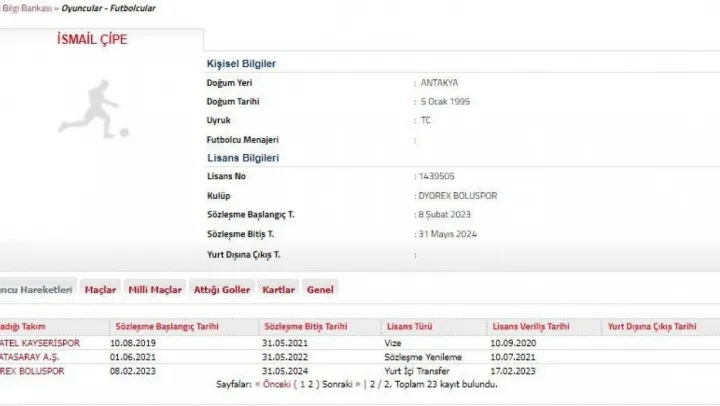 Spor Toto 1. Lig ekibi Boluspor, Galatasaray'dan kaleci İsmail Çipe ile 31 Mayıs 2024 yılına kadar sözleşme imzalandığını Türkiye Futbol Federasyonu'na bildirdi.