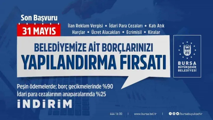 '7440 Sayılı Bazı Alacakların Yeniden Yapılandırılması ile Bazı Kanunlarda Değişiklik Yapılmasına Dair Kanun' çerçevesinde Bursa Büyükşehir Belediyesi'ne vadesi 31 Aralık 2022 tarihi ve öncesi borcu bulunan mükelleflere borçlarını yapılandırma fırsatı sunuluyor. Son başvuru tarihi 31 Mayıs 2023 olan yapılandırma çerçevesinde borçların peşin ödemesi halinde, gecikme faizinde yüzde 90 oranında indirim sağlanmasının yanında ayrıca 48 aya kadar taksit imkanı sunuluyor.