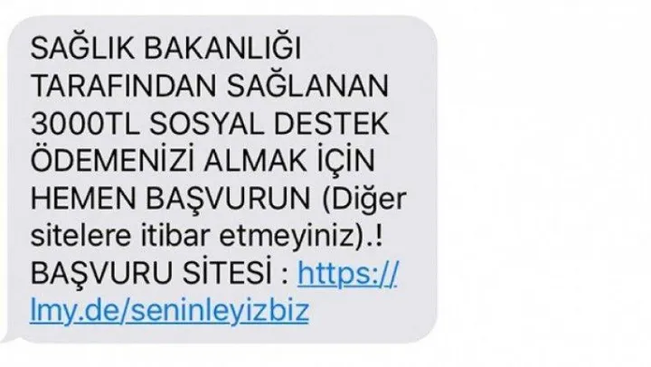 Dolandırıcılar tarafından bugün vatandaşların cep telefonuna, 'Sağlık Bakanlığı tarafından sağlanan 3 bin lira sosyal destek ödemenizi almak için hemen tıklayınız, diğer sitelere itibar etmeyiniz' yazılı SMS gönderilip, link verildi. Bu SMS'in vatandaşları dolandırmak için atıldığı, vatandaşların linke tıklaması halinde bütün hesaplarının ele geçirilerek içinin boşaltıldığı belirlendi.